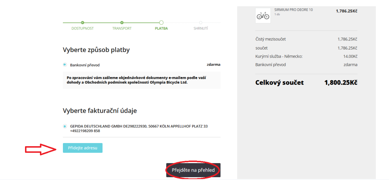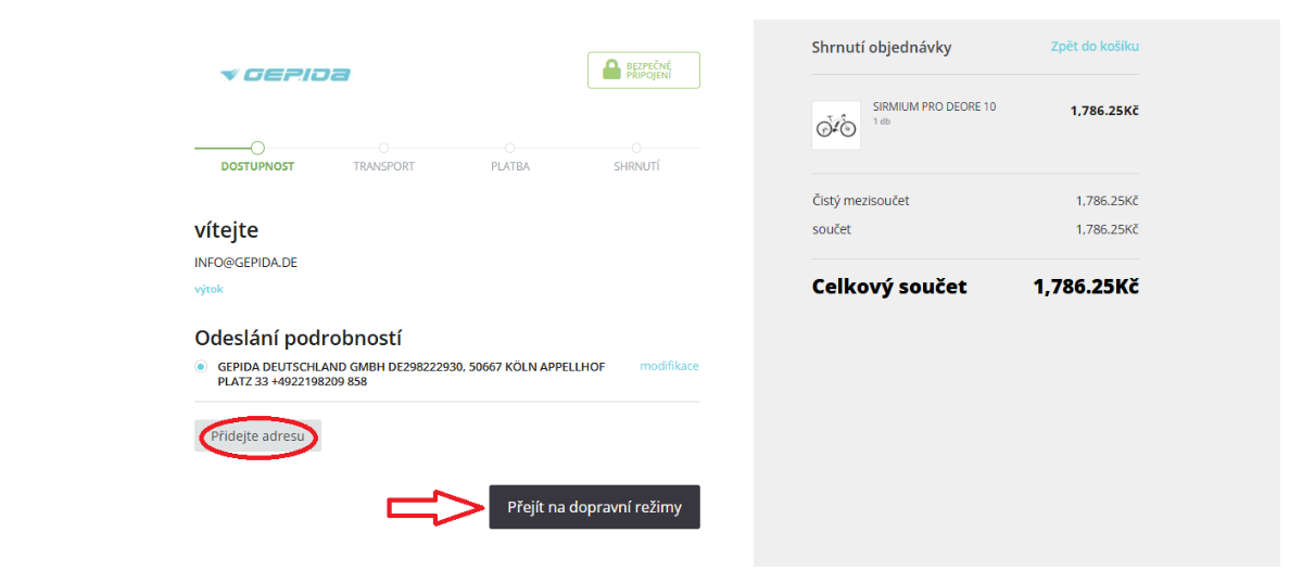 V tomto bodě máte možnost aktualizovat stávající adresu, přidat novou nebo přejít ke způsobu doručení.