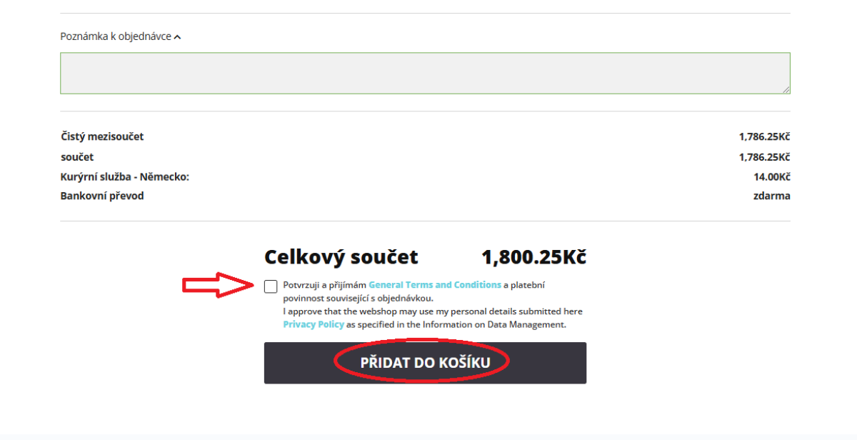 Zkontrolujte prosím svou objednávku a pokud je vše správné, přijměte naše Obchodní podmínky a Zásady ochrany osobních údajů, poté klikněte na tlačítko „Objednat“.
